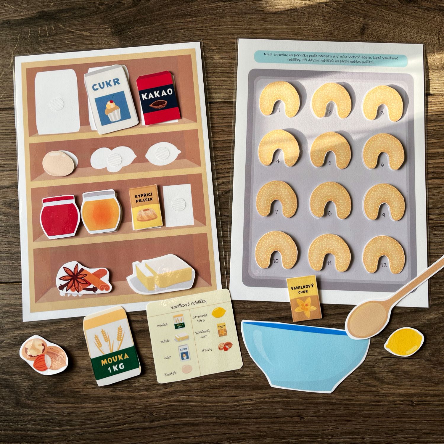 •  spižírna s potravinami a seznam receptů – děti si dle receptu vyberou správné surovin, mohou je nasypat do mísy a zamíchat vařečkou, pokračují na další úkol, kde cukroví upečou