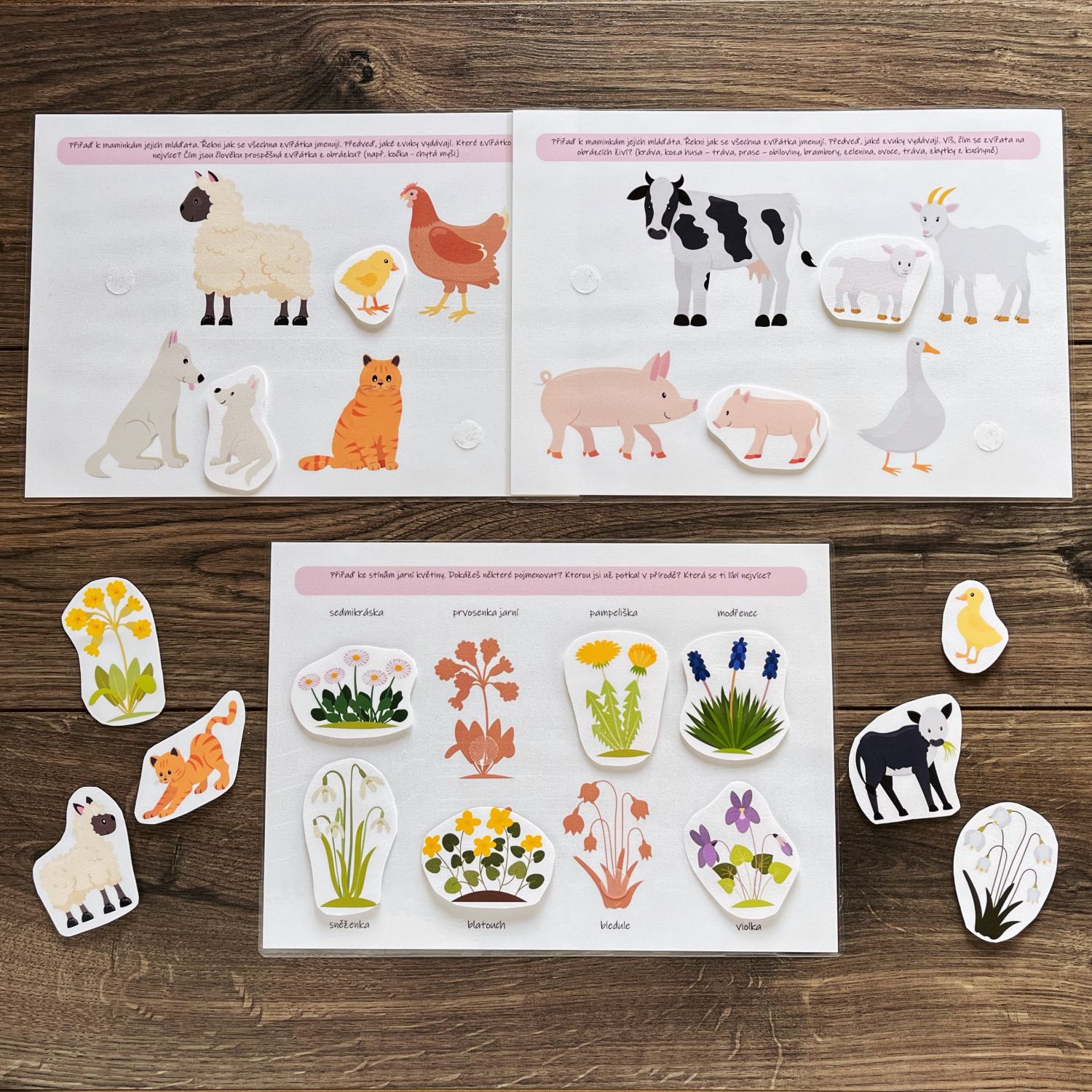 • kartičky s jarními motivy – více variant pro hry: klasické pexeso, přiřazování stínů, vytváření logických řad, třídění zvířátek koukajících vlevo či vpravo, třídění na rostliny a zvířata, opakování nabyté slovní zásoby